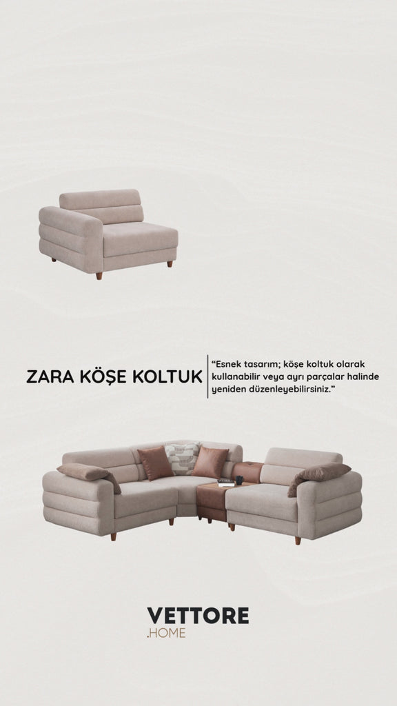 Modern çizgileri, akıllı detayları ve fonksiyonel yapısıyla bu köşe koltuk koleksiyonu; yaşam alanlarında hem şıklığı hem de kullanım kolaylığını bir arada sunmak isteyenler için tasarlanmıştır.